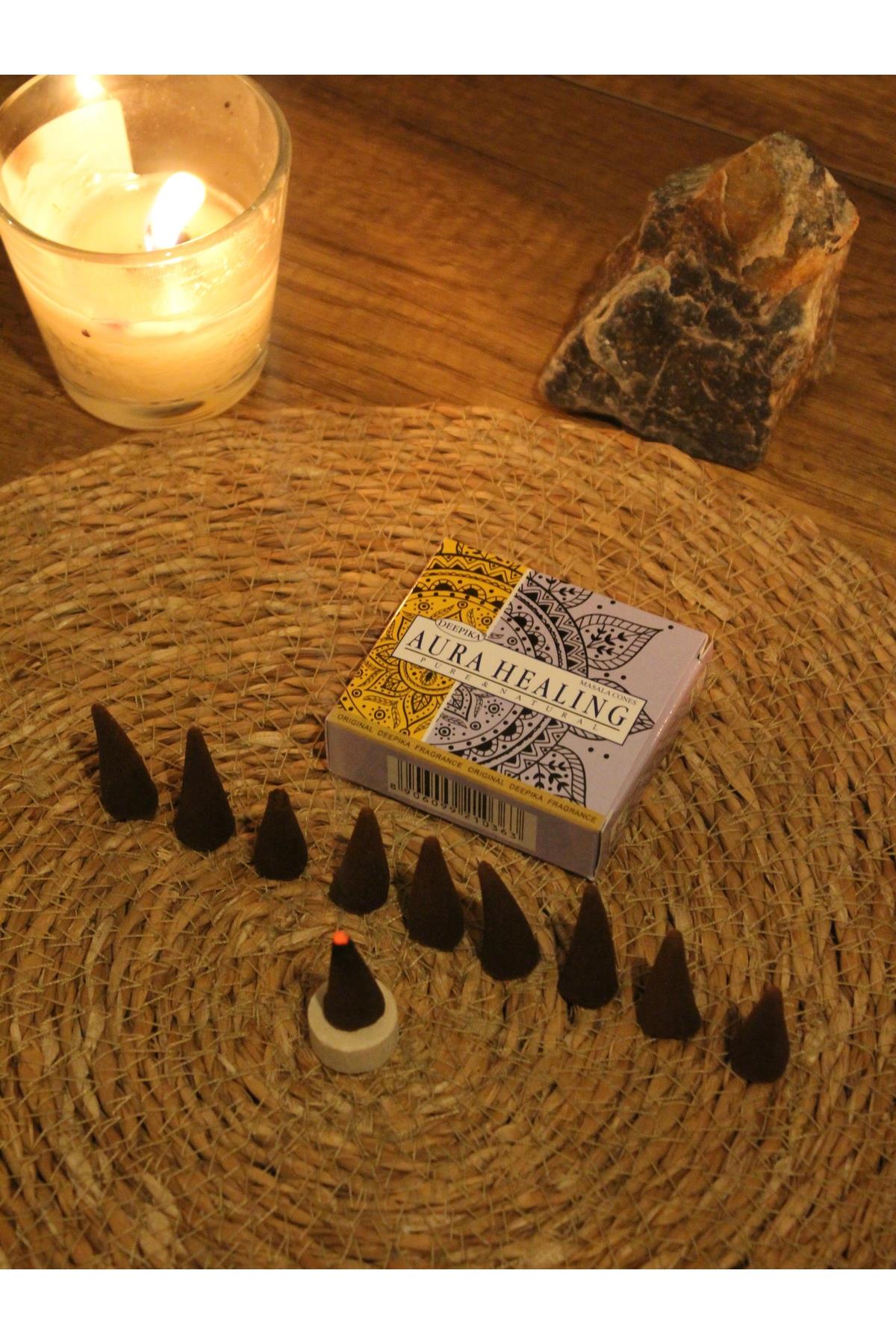 Aura healing konik tütsü, doğal ve kokusuyla huzur verici bir atmosfer yaratır; 10 adet paket içeriğiyle uzun süreli kullanım imkanı sunar. ;