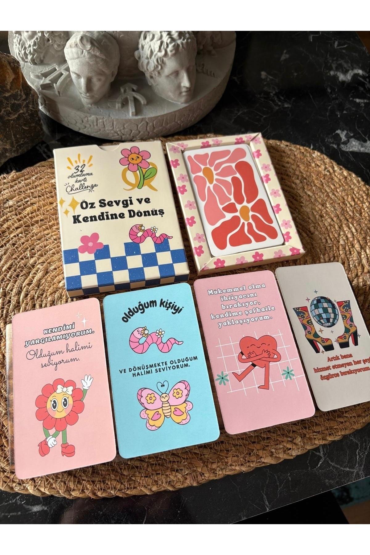 - Kişisel gelişim yolculuğunuzda size rehberlik edecek 32 karttan oluşan set, öz sevginizi ve kendinize olan saygınızı artırmak için tasarlanmıştır.; - Her kartta yer alan olumlu mesajlar ve görsellerle, zihninizi pozitif düşüncelere yönlendirir ve özgüveninizi pekiştirir.; - Uzun süreli kullanım için ideal olan bu kartlar, her an yanınızda taşıyabileceğiniz bir motivasyon kaynağıdır.; - Türkçe içerikleriyle dil engeli olmadan, kendi kendine farkındalık ve iyileşme sürecini kolaylaştırır.