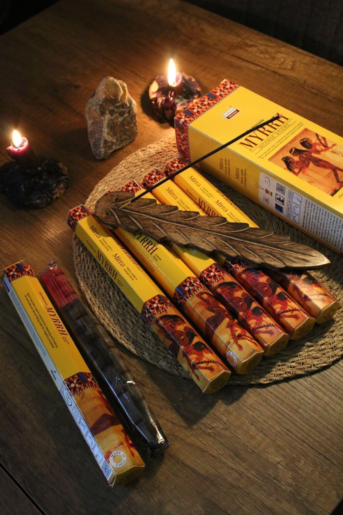 Tütsüler şifalı özellikleri sayesinde insanlar tarafından yüzyıllardır kullanılmaktadır. Rahatlatıcı kokusu ile ruhunuzu onarmaya ve bedeninizi dinlendirmeye yardımcı olur. Günün yorgunluğunu atmak, sakinleşmek ve an’da kalmaya yardımcı olur. Tütsü kullanımı negatif enerjileri temizlemek ve onlardan korunmak için önerilmektedir. Myrrh tütsüyü meditasyonunuzda, ritüllerinizde, yoga yaparken; evinizde veya ofisinizde kullanabilirsiniz. Kutuda 6 paket ve her bir pakette 20 çubuk tütsü bulunmaktadır. Hem kullanışlı hem dekoratif yaprak tütsülük mekanınıza özgün bir dokunuş katar. Çubuk tütsülerle kullanıma uygundur.
